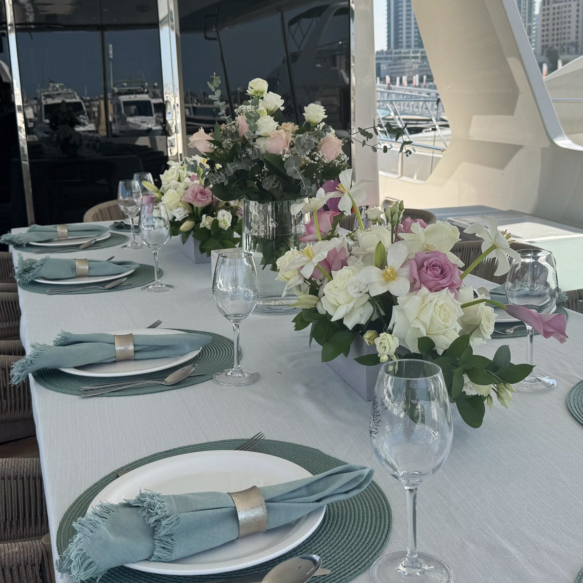 fresh flowers centerpieces on the yacht